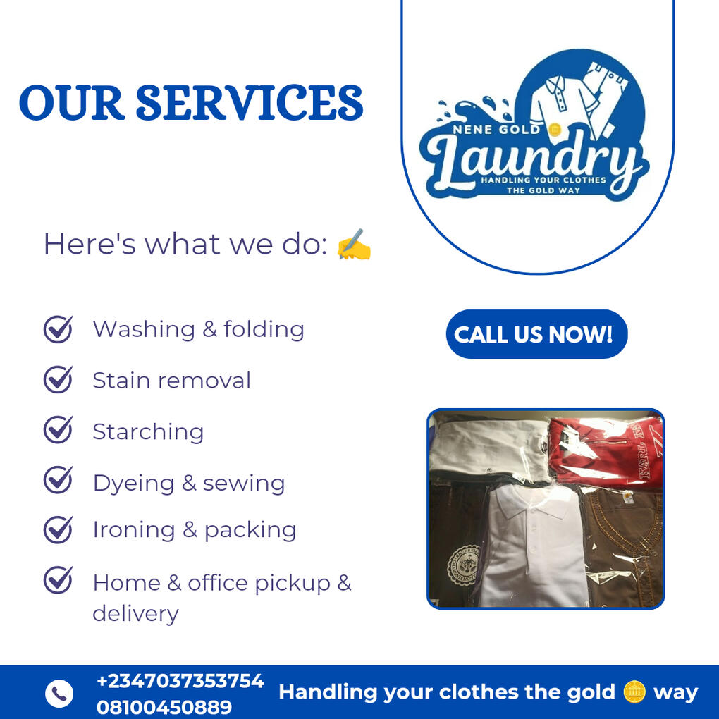 NENE GOLD LAUNDRY – Where Dirt Meets Clean!At Nene Gold Laundry, we redefine laundry services with a touch of excellence and unmatched convenience. Our premium laundry solutions ensure your garments are not just clean but radiantly fresh, soft, and perfectly cared for. Whether it’s your everyday wear, delicate fabrics, or bulky items, we handle them all with professionalism and precision.Experience hassle-free laundry with fast turnaround times, eco-friendly processes, and customer-centric service. At Nene Gold Laundry, your clothes shine as bright as our commitment to quality. 🧺✨Let us take the load off your hands while you focus on what matters most!